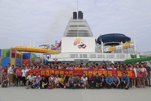 通體燈火輝煌,龐大的身軀猶如移動的城堡,靠近了向上望去竟有頭暈?zāi)垦5母杏X——它就是全亞洲最大的云頂夢號郵輪。5月28-6月2日,嘉博公司的員工和家屬共計177人,將在這艘郵輪開始第十一屆嘉博幸福之旅。
